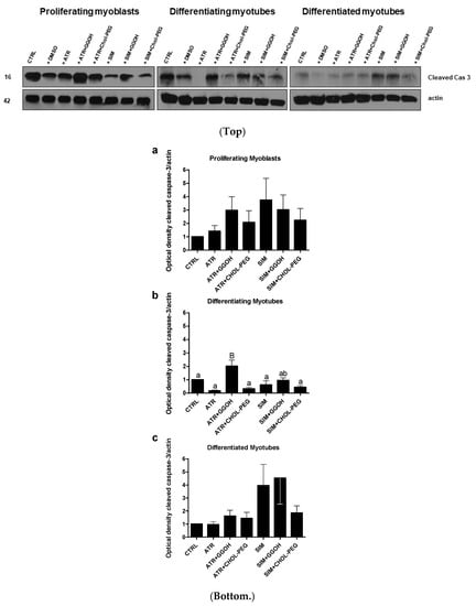 Top. Western blots of cleaved caspase-3 with regard to actin. Effect of geranylgeraniol (GGOH, 10 µM) on cleaved caspase-3 protein expression levels affected by MEV pathway modulators (atorvastatin—ATR, simvastatin—SIM) or water-soluble cholesterol (Chol-PEG). In untreated myoblasts, the expression levels of cleaved caspase-3 protein (cleaved cas 3) decreased accordingly with the differentiation stage. ATR and SIM markedly reduced cleaved cas 3 protein expression levels in proliferating and differentiating but not in differentiated myotubes. Irrespective of co-treatment, GGOH administration elevated cleaved cas 3 protein expression levels and, again, without observing the differences found in differentiated myotubes. In contrast to GGOH, the Chol-PEG co-treatment did not affect cleaved cas 3 protein expression levels regardless of co-treatment. Representative blots. The results are indicative of three independent experiments. Bottom. Densitometry analysis of cleaved caspase-3 (cleaved cas 3) protein expressions levels calculated in relation to house-keeping protein (actin). The effect of non-sterol isoprenoid GGOH and soluble cholesterol treatments on cleaved cas 3 in C2C12 myoblasts affected by statins (atorvastatin—ATR, simvastatin—SIM) or water-soluble cholesterol (Chol-PEG). Differentiating C2C12 myoblasts exposed for 24, 72, or 120 h to statins (IC50), ((a) Day 1—proliferating myoblasts; (b) Day 3—differentiating myotubes; (c) Day 5—differentiated myotubes). Different small letters indicate statistically significant (p < 0.05), whereas different capital letters indicate statistically highly significant (p < 0.01) differences between the means, respectively. The results are indicative of three independent experiments.
