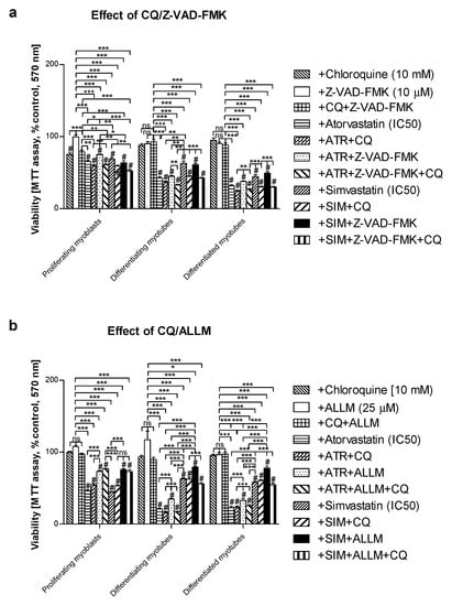 Effect of pan-caspase inhibitor Z-VAD-FMK or calpain inhibitor ALLM on cell viability (MTT assay) affected by MEV pathway modulators (atorvastatin—ATR, simvastatin—SIM) in the presence or absence of chloroquine (CQ, 10 mM). Differentiating C2C12 myoblasts were exposed for 24, 72, or 120 h to statins (IC50), (Day 1—proliferating myoblasts; Day 3—differentiating myotubes; Day 5—differentiated myotubes). (a) Both ATR and SIM diminished cell viability (IC50). Z-VAD-FMK itself had no effect on cell viability (p > 0.05). However, it overruled the myotoxicity evoked by ATR but not SIM administration in proliferating myoblasts only (p < 0.05). Upon CQ addition, the cell viability that had already been reduced by ATR or SIM co-treatment shrunk considerably further (p < 0.01). (b) ALLM itself had no effect on cell viability (p > 0.05). In contrast to Z-VAD-FMK, ALLM (25 μM) markedly recovered cells from ATR- or SIM-dependent myotoxicity in proliferating myoblasts, differentiating and differentiated myotubes (p < 0.001). ALLM recovered muscle cell viability less efficiently in ATR- than in SIM-dependent SAM. Statistically significant differences from untreated control cells are marked by # (at least at the level of p < 0.05, ns—non significant). * p < 0.05, ** p < 0.01, *** p < 0.001. The results are indicative of three independent experiments performed in eight replicates.