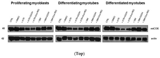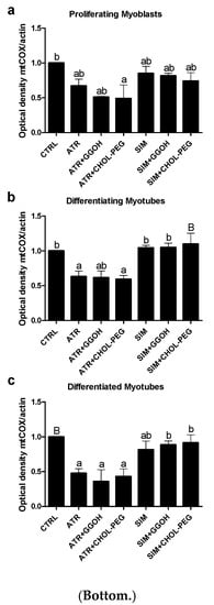 Top. The effect of GGOH or Chol-PEG co-treatment upon mitochondrial cytochrome c oxidase protein expression levels in statin-treated C2C12 muscle cells. In untreated myoblasts, the expression levels of cytochrome c oxidase (COX) protein remained high throughout muscle differentiation. COX expression levels dropped considerably upon ATR treatment. ATR markedly reduced COX protein expression levels in proliferating myoblasts and differentiating and differentiated myotubes. Irrespective of co-treatment with GGOH or Chol-PEG protein, expression levels of COX remained low in proliferating myoblasts and differentiating and differentiated myotubes. There was no such effect observed upon SIM treatment, whereby COX expression levels did not change either to SIM, GGOH or Chol-PEG co-treatment. Representative blots. The results are indicative of three independent experiments. Bottom. Densitometry analysis of mitochondrial cytochrome c oxidase subunit I (mtCOX1) protein expressions levels calculated in relation to house-keeping protein (actin). Effect of non-sterol isoprenoid GGOH and soluble cholesterol treatments on mtCOX1 in C2C12 myoblasts affected by statins (atorvastatin—ATR, simvastatin—SIM) or water-soluble cholesterol (Chol-PEG). Differentiating C2C12 myoblasts exposed for 24, 72, or 120 h to statins (IC50), ((a) Day 1—proliferating myoblasts; (b) Day 3—differentiating myotubes; (c) Day 5—differentiated myotubes). Different small letters indicate statistical significance (p < 0.05), whereas different capital letters indicate high statistically significant (p < 0.01) differences between the means, respectively. The results are indicative of three independent experiments.