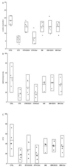 To determine the mitochondrial bioenergetics, the tested cells (n = 5) were subjected to the following experimental treatments: CTRL (control), ATR, ATR + GGOH, ATR + Chol-PEG, SIM, SIM + GGOH, SIM + Chol-PEG.