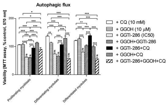 The effect of geranylgeraniol (GGOH, 10 µM) on cell viability (MTT assay) affected by geranylgeranyl transferase I (GGTI-286, IC50) in the presence or absence of chloroquine (CQ, 10 mM). Differentiating C2C12 myoblasts were exposed for 24, 72, or 120 h to GGTI-286 (IC50), (Day 1—proliferating myoblasts; Day 3—differentiating myotubes; Day 5—differentiated myotubes). Neither CQ nor GGOH affected the cell viability in comparison to control untreated cells (p > 0.05); GGOH could not rescue the muscle cell viability reduced by GGTI-286 in proliferating myoblasts and differentiating and differentiated myotubes (p > 0.05). The effect of GGOH was not affected by CQ administration (p > 0.05); CQ effectively reversed the negative effect of GGTI-286 on cell viability. GGOH blocked the effect of CQ on the GGTI-286-dependent drop in cell viability in differentiating and differentiated myotubes (p < 0.001) but not in proliferating myoblasts (p > 0.05). * p < 0.05, ** p < 0.01, *** p < 0.001, for comparison between the means. Statistically significant differences from untreated control cells are marked by # (at least at the level of p < 0.05). The results are indicative of three independent experiments performed in eight replicates.