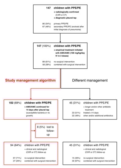 Here, we present a 15-year single-center cohort study of children with PPE/PE by implementing a management algorithm including diagnostic pleural tap and a 14-day course of empirical antibiotic treatment. We hypothesized that these patients recover following a 14-day course of AMX/AMC treatment confirmed or modified by microbiological findings from pleural tap. We further compared the outcome for PPE/PE patients managed without surgical interventions (i.e., only diagnostic pleural tap) or with surgical interventions (e.g., pleural draining catheter and VATS).