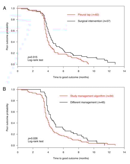 Outcome analysis of 139 children with parapneumonic effusion or pleural empyema (PPE/PE). (A) Time to good outcome of PPE/PE with pleural tap alone (red) or surgical intervention (black) (i.e., pleural draining catheter ± fibrinolysis, video-assisted thoracoscopic surgery, or thoracotomy). (B) Time to good outcome of PPE/PE managed according to the study management algorithm (red) or with different management (black). Poor outcome was defined as no clinical recovery and/or abnormal chest radiograph according to the British Thoracic Society (BTS) guidelines []. The log-rank test was used to compare the time to outcome.