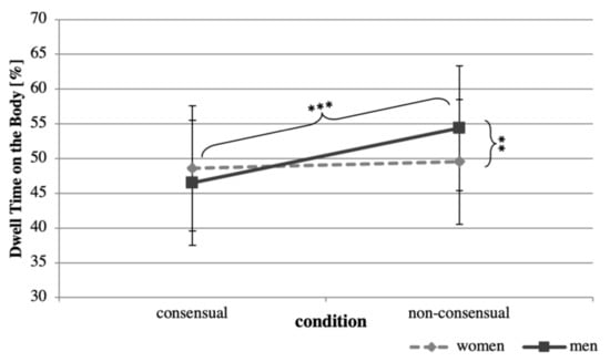 The objectifying gaze, defined as the relative amount of time looking at the body, was influenced by condition and participant gender. Men assuming non-consensual distribution displayed the objectifying gaze more than men assuming voluntary sharing and more than women assuming either manner of distribution. Hence, we were able to demonstrate for the first time that the supposed way of distribution influences how participants look at images and how strongly they display the objectifying gaze. Previous research suggests that especially women are sexually objectified in the media [,,] and during interpersonal interactions [,]. The objectifying gaze has been linked to negative social perceptions, dehumanization, and self-objectification [,,]. While an appearance-focus in women has been linked to negative social perceptions [,] and severe mental health problems [], no comparable research on men exists.