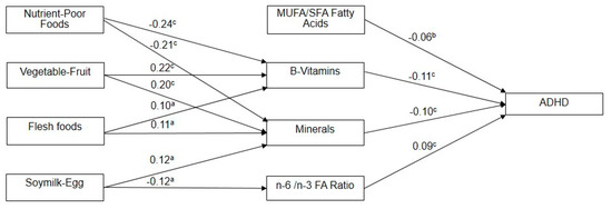 Model for demonstrating the path analysis from diet factors, nutrition factors to a diagnosis of ADHD. MUFA: monounsaturated fatty acids; SFA: saturated fatty acids; a p < 0.05, b p < 0.01, c p < 0.001.