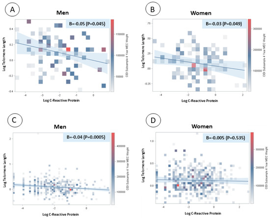 Linear regression models between log-transformed C-reactive protein and log-transformed telomere length by sex and depression status. (A) Men with major depression or depressed affect; (B) women with major depression or depressed affect; (C) men without depression; and (D) women without depression.