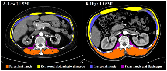 Representative CT images of L1 skeletal muscle area measurement: A patient with low L1 SMI (A) and a patient with high L1 SMI (B). Total skeletal muscle area was measured using the following four components: Paraspinal muscle (red), extracostal abdominal wall muscle (yellow), intercostal muscle (blue), and psoas muscle and diaphragm (purple). The measured L1 SMAs were 36.24 (A) and 149.56 cm2 (B), and L1 SMIs were 16.00 (A) and 49.68 cm2/m2 (B), respectively. CT = computed tomography; L1 = first lumbar vertebra; SMA = skeletal muscle area; SMI = skeletal muscle index.