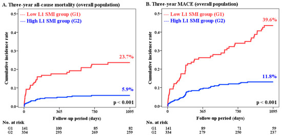 A comparison of 3-year clinical outcomes between the groups is displayed in Table 2 and Figure 2. Compared to the high L1 SMI group, the low L1 SMI group had significantly higher incidence of 3-year all-cause mortality (23.7% vs. 5.9%; hazard ratio (HR): 4.34; 95% CI: 2.45 to 7.69; p < 0.001) and MACEs (39.6% vs. 11.8%; HR: 3.82; 95% CI: 2.54 to 5.74; p < 0.001). Other patient-oriented outcome measures such as MI and repeat revascularization also showed significantly higher incidence in the low L1 SMI group than in the high L1 SMI group. Detailed information about the cause of non-cardiovascular death is provided in Table S2.