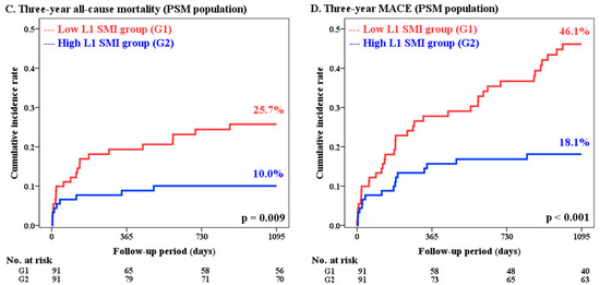 Propensity score-matched analysis yielded 91 pairs of study participants. The baseline characteristics and procedural profiles were well balanced between the two groups (Table 1). Similar to the results for the whole study population, the incidence of 3-year all-cause mortality and MACEs was significantly higher in the low L1 SMI group than in the high L1 SMI group (25.7% vs. 10.0%, p = 0.009; and 46.1% vs. 18.1%, p < 0.001, respectively) (Table 2). Low L1 SMI remained as a strong risk factor for both 3-year all-cause mortality and MACEs (HR: 2.68; 95% CI: 1.23 to 5.83; p = 0.013; and HR 2.80; 95% CI: 1.56 to 5.03; p = 0.001, respectively) (Table 3).