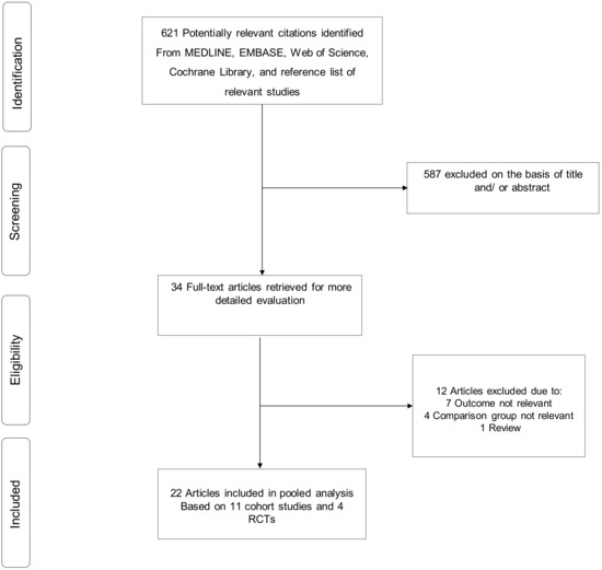 The literature search strategy identified 621 potentially relevant articles. After the initial screening of titles and abstracts, 34 articles remained for full text evaluation. Following detailed evaluation of full texts, 12 articles were excluded. The remaining 22 articles based on 11 distinct observational cohort studies and 4 RCTs met the inclusion criteria and were included in the review (Figure 1; Table 1) [10,12,13,14,24,25,26,27,28,29,30,31,32,33,34,35,36,37,38,39,40,41].