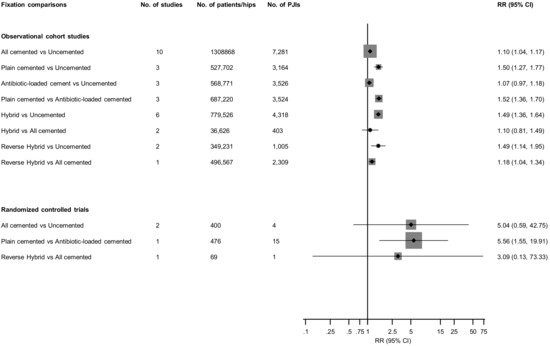 In RCTs, there were no differences in PJI risk when all cemented fixations were compared with uncemented or reverse hybrid fixations; however, one trial conducted in the 1970s and based on 476 THRs and 15 PJIs, reported an increased PJI risk comparing plain cemented with antibiotic-loaded cemented fixations (Figure 2; Supplementary Figure S6).