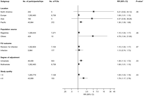 Comparison of all cemented fixation with uncemented fixation and the risk of prosthetic joint infection in observational studies, grouped according to several study characteristics. CI, confidence interval (bars); PJI, prosthetic joint infection; and RR, relative risk.
