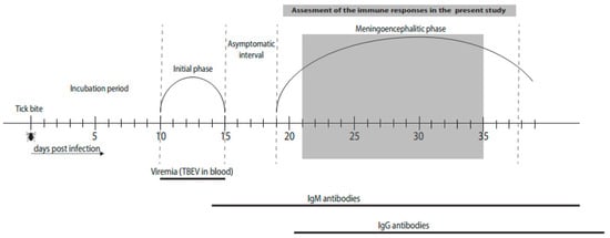 Host immune response is thought important for controlling TBE infection and for the resulting clinical manifestations of this disease, but the understanding of TBE pathogenesis remains incomplete [8,9]. Emerging evidence in animal models and in patients demonstrates that both cellular and humoral immune responses are triggered to TBEV infection. As with other flaviviruses, studies in mice suggest that a robust humoral immune response is critically important in controlling TBEV infection [10,11,12,13]. The E protein of the TBEV, which is important for the attachment and entry of the virus into cells and for fusion with endosomal membranes, is the major target and inducer of neutralizing antibodies [14]. Studies of neutralizing antibodies in experimentally infected laboratory animals [15,16,17] and in TBE patients [18] suggest that individuals with mild TBE have higher concentrations of antibodies than those with a severe form of the disease, implying their role in disease pathogenicity. This distinction was clearly evident also in a recent study of adult patients with TBE, in which a significant negative association was observed between the level of specific TBEV serum IgG antibodies (during the initial examination of the meningitic/meningoencephalitic phase) and the severity of acute illness [19].