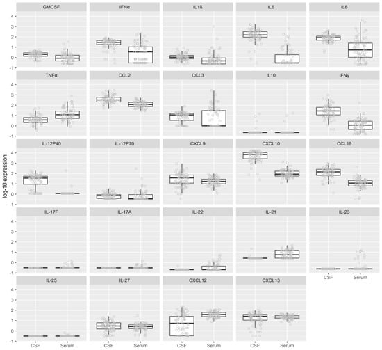 The gray points represent the individual data values measured in CSF and serum. The superimposed boxplots represent the first quartile (i.e., lower edge of the box), median (i.e., bar inside the box), third quartile (i.e., upper edge of the box), and minimum and maximum (i.e., length of the whiskers). If any points are at a greater distance from the quartiles than 1.5 times the interquartile range (IQR), the whisker length represents a distance of 1.5 times IQR from the upper or lower quartile.