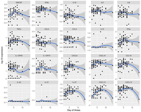 In general, CSF cytokines and chemokines reached the highest levels on days 5–7 of the meningoencephalitic phase and decreased thereafter. However, the association of cytokine/chemokine levels with the duration of illness was statistically significant only for B cell chemoattractant, CXCL12 (p = 0.003) and a Th17-associated cytokine, IL-27 (p = 0.025). Dynamics of the CSF chemokines/cytokines is depicted in Figure 3. No corresponding associations were found in serum (Figure S7).