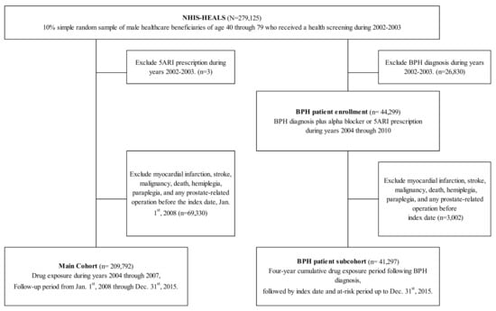 Among 279,125 male beneficiaries who received a health screening during 2002–2003, a total of 209,792 males were observed from the index date after exclusion of prior drug use or MI, stroke, malignancy, hemiplegia, paraplegia, death, or prostate operations (Figure 1). For the BPH patient subcohort, 48,140 patients were enrolled between 2004 through 2010, and observed for outcomes following four years of drug exposure (Figure 1).