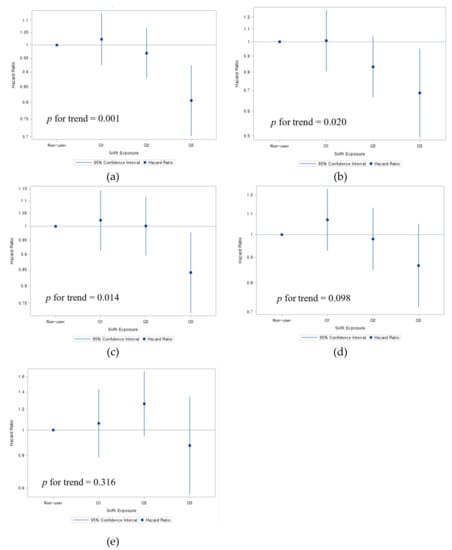 We conducted a chi-square test between 5ARI use and covariates. Using a multivariate Cox proportional hazards model adjusted for age, hypertension, diabetes, high cholesterol, body mass index, smoking habit, alcohol consumption frequency, exercise frequency, socioeconomic status in quartiles, acute urinary retention, atrial fibrillation or flutter, angina, Charlson Comorbidity Index, outpatient visits, alpha-blocker use, aspirin use, NSAID use, HMG-CoA reductase inhibitor use, benign prostatic hyperplasia, and year of first 5ARI prescription or year of BPH diagnosis, we estimated hazard ratios of 5ARI users relative to non-users. For a dose-response analysis of 5ARI users, we performed a multivariate Cox proportional hazards analysis of the tertiles of users with reference to non-users. The analysis of the p-for-trend was determined by treating the categorical variable of non-users, first tertile of users, second tertile of users, and third tertile of users as numerical values of 0, 1, 2, and 3, respectively. To assess the risks among low-risk populations, we performed a stratified analysis by major risk factors such as age, hypertension, diabetes, and concurrent aspirin use. All data mining and statistical analysis were implemented using SAS®, version 9.4 (SAS Institute, Cary, NC, USA).