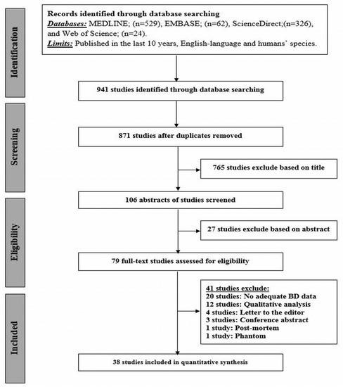 Figure 1 presents an overview of the systematic search of the literature through different databases. The complete search yielded 941 studies. After removing duplicates (n = 70), 871 were screened, based on their titles, which resulted in 765 being excluded, followed by 27 of the remaining studies being excluded on the basis of their abstracts. Of the remaining 79 studies, the full manuscript was retrieved and reviewed. Forty-one studies did not meet the selection inclusion criteria: no adequate breast density data (n = 20), qualitative analysis (n = 12), editorials (n = 4), conference abstracts (n = 3), post-mortem study (n = 1), and phantom study (n = 1). Finally, 38 studies attained the inclusion criteria [1,2,3,5,11,25,26,27,28,29,30,31,32,33,34,35,36,37,38,39,40,41,42,43,44,45,46,47,48,49,50,51,52,53,54,55,56,57] and were included in the analysis as shown in Table 1.