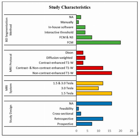 Table 1 demonstrates some of the main characteristics of the 38 included studies, while Figure 2 shows details of the study design and MRI system used in these studies. Several MRI sequences were used to enable the precise differentiation between adipose and fibroglandular tissues; of these, non-contrast-enhanced T1-weighted was widely used either with 2D spin echo or 3D gradient echo. In fact, 16 studies (41.03%) used non-contrast-enhanced T1-weighted [1,2,26,27,28,29,31,33,35,44,45,48,49,50,51,53], while in 12 studies (30.77%) non-contrast-enhanced images were integrated with contrast-enhanced images [25,36,37,38,39,40,41,42,43,44,47,49]. In terms of breast density segmentation/measurement, the majority of the studies (20 studies; 51.28%) used FCM clustering algorithm [1,2,11,25,26,27,28,29,31,32,33,34,35,36,37,38,39,40,41,42], while 7 studies (17.95%) used FCM and N3 algorithm [45,46,47,48,49,50,51], 4 studies (10.26%) interactive thresholding algorithm [3,5,52,53], 4 studies (10.26%) in-house customized software [29,53,54,55], one study (2.56%) manual software [57]; however, two studies did not provide the information [43,44].