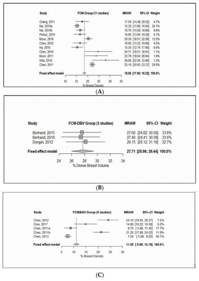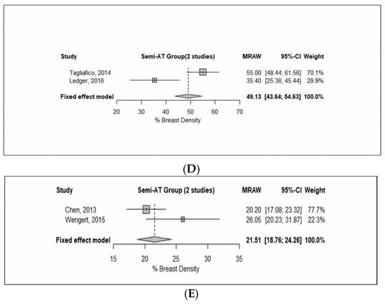 Forest plot of the study means, and 95% confidence limits of the breast density among 21 included studies in the subgroup meta-analyses. (A) Fixed effect meta-analysis of the fuzzy c-mean clustering (FCM) group of studies of % breast density. (B) Fixed effect meta-analysis of the FCM group of studies of % dense breast volume. (C) Fixed effect meta-analysis of the FCM and N3 group of studies of % breast density. (D) Fixed effect meta-analysis of the semi-automated threshold group of studies of % breast density. (E) Fixed effect meta-analysis of the semi-automated threshold group of studies of % breast density.
