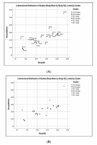 Scatter plot of the study means versus SDs using 6-clusters memberships of the 21 included studies in the subgroup meta-analyses. Legend indicates the number of studies in each cluster, solid fill represents clusters with two or more studies, while open markers represent singleton study. Scatterplot of study means versus SDs with study codes (A) and without study codes (B).
