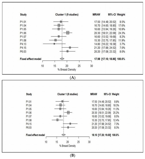 Forest plot of the study means, and 95% confidence limits of the studies in Cluster 1 with/without P4.13 (Choi, 2017) of % breast density. (A) Fixed effect meta-analysis of the studies in Cluster 1 (9 studies) of % breast density. (B) Fixed effect meta-analysis of the studies in Cluster 1 (8 studies) of % breast density.