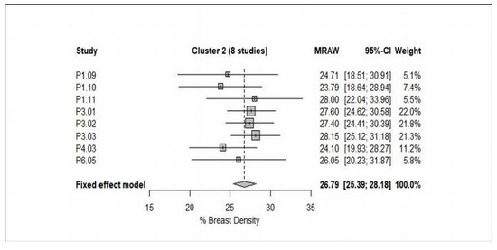 Forest plot of the study means, and 95% confidence limits of the studies in Cluster 2 (8 studies) of % breast density.