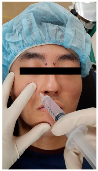 After the induction of anesthesia, the surgical site, including nasal septum, nasal turbinate, columella, and nasal dorsum, was infiltrated with a 10 mL mixture of 1% lidocaine and 10 μg/mL epinephrine for local anesthesia and intraoperative bleeding reduction [20,21]. The surgical procedure was performed while using an open septorhinoplasty approach. At the end of surgery, nasal packing was carried out using a polyvinyl alcohol sponge (Merocel®; Medtronic Inc., Minneapolis, MN, USA), and Joseph dressings with splints (Aquasplint; Aquaplast Inc., Wyckoff, NJ, USA) were applied [20].