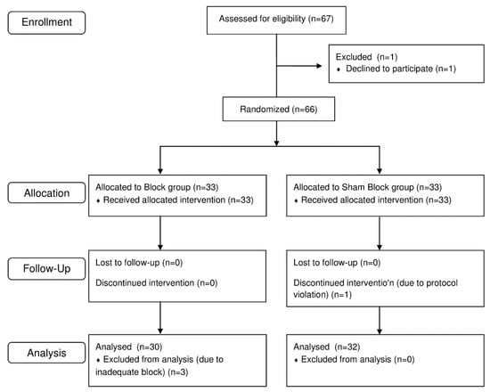 In total, 67 patients were assessed for eligibility and 66 were enrolled in the study. Four patients were excluded: three in the Block group due to inadequate block and one in the Sham Block group, owing to protocol violation (the patient received a rescue analgesic not specified in the protocol). For the remaining 62 patients, no data or measurements were missing or lost. Figure 3 presents the study flow chart. The patient characteristics were similar in both groups (Table 1).