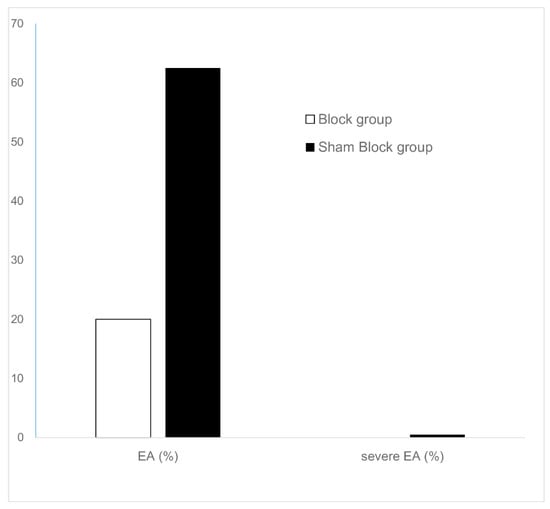 The incidence of EA was lower in the Block group as compared to the Sham Block group (six (20.0%) in the Block group versus 20 (62.5%) in the Sham Block group, p = 0.002). One patient in the Sham Block group exhibited severe EA, while no patients in the Block group exhibited severe EA (Figure 4).