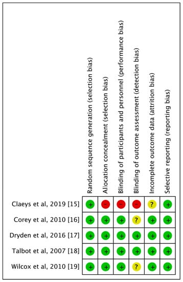 - Higgins, J.P.; Altman, D.G.; Gøtzsche, P.C.; Jüni, P.; Moher, D.; Oxman, A.D.; Sterne, J.A. The Cochrane Collaboration’s tool for assessing risk of bias in randomised trials. Bmj 2011, 343, d5928. [Google Scholar] [CrossRef]