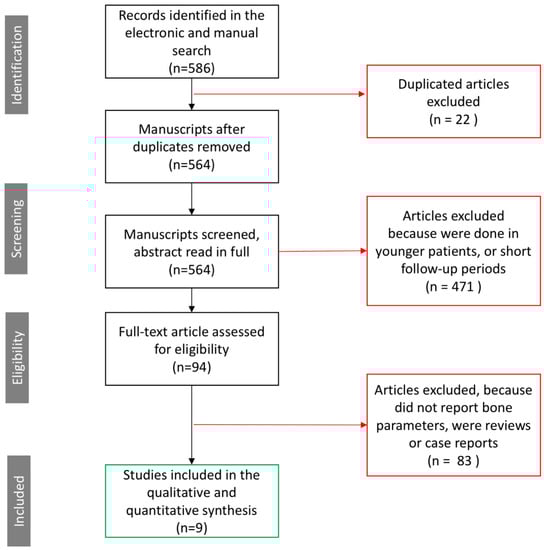 The Preferred Reporting Items for Systematic Reviews and Meta-Analyses (PRISMA) workflow. From the initial 586 articles, only nine articles fulfilled the inclusion criteria and were considered for this systematic review.