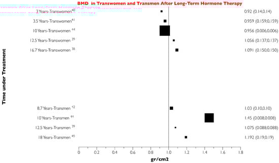 The BMD condition of M to F and F to M transgender patients receiving long-term cross-sex pharmacotherapy is contradictory. For Sosa et al. (2003) [38], Ruetsche et al. (2005) [39], Van Caenegem et al. 2012 [42], and Wiepjes et al. 2018 [44], both M to F and F to M patients will possess a stable or increased BMD compared to matched male or female controls.
