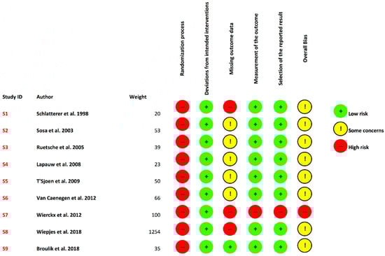 Risk of bias assessment. From the nine included studies, eight had some concerns and only one study showed an overall high risk of bias. S (study identification), Weight (sample size/number of patients per study).