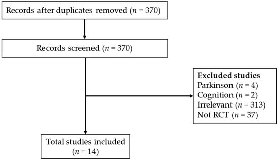 A database search was made to exclude articles with a PEDro score of less than 5 and non-English publications. A total of 14 articles were included. These 14 articles were included in this scoping review (Figure 1).