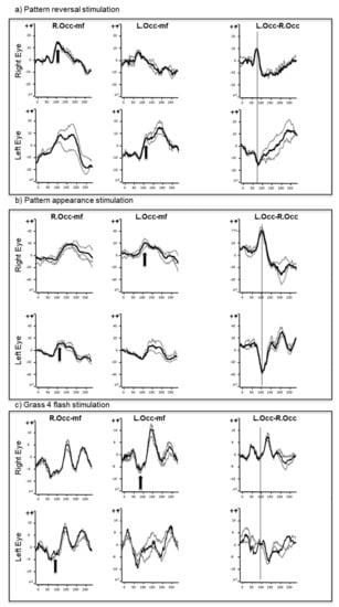 - Mellow, T.B.; Liasis, A.; Lyons, R.; Thompson, D. When do asymmetrical full-field pattern reversal visual evoked potentials indicate visual pathway dysfunction in children? Doc. Ophthalmol. 2011, 122, 9–18. [Google Scholar] [CrossRef]