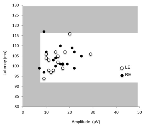Amplitude and latency of P100 during monocular full field stimulation to pattern reversal test checks subtending 50 min of arc presented in a 28 degree field. The white area represents the 1st and 99th centile of the laboratories normal limits, whilst gray represents outside of normal limits. Responses for all eyes except two were within normal limits. LE: left eye; RE: right eye.