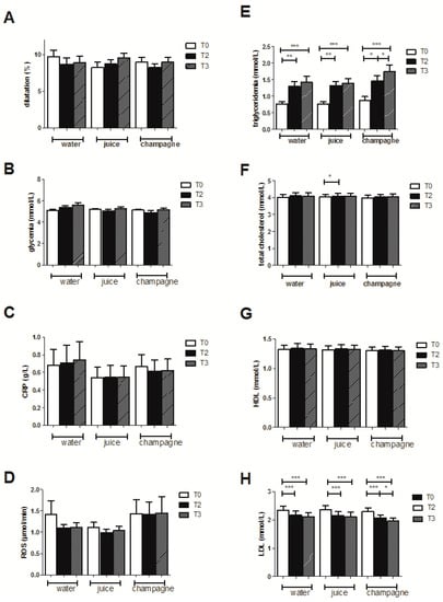 Effects of the high-fat meal and ingestion of water, fruit juice, or champagne in the 17 subjects. (A) Endothelial function as quantified by flow-mediated dilatation of the humeral artery (FMD), (B) glycemia levels, (C) CRP, (D) ROS production, (E) triglyceridemia, (F) total cholesterol, (G) LDL, and (H) HDL levels. Results are expressed as means ± SEM. * p < 0.05, ** p < 0.01, *** p < 0.001.