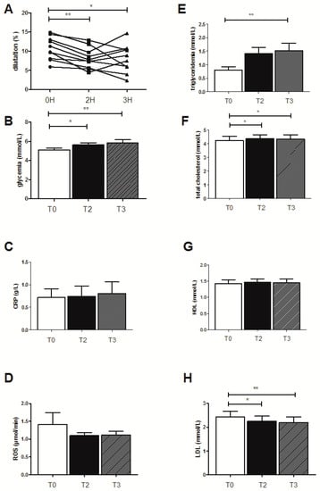 Effects of the high-fat meal on the ten subjects showing decreased FMD when drinking water. (A) Endothelial function as quantified by flow-mediated dilatation of the humeral artery (FMD), (B) glycemia levels, (C) CRP, (D) ROS production, (E) triglyceridemia, (F) total cholesterol, (G) LDL, and (H) HDL levels. Results are expressed as means ± SEM. * p < 0.05, ** p < 0.01.
