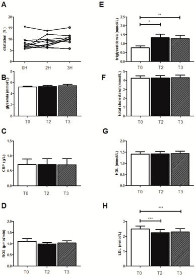 Effects of the high-fat meal on the ten subjects when drinking juice. (A) Endothelial function as quantified by flow-mediated dilatation of the humeral artery (FMD), (B) glycemia levels, (C) CRP, (D) ROS production, (E) triglyceridemia, (F) total cholesterol, (G) LDL, and (H) HDL levels. Results are expressed as means ± SEM. * p < 0.05, ** p < 0.01, *** p < 0.001.