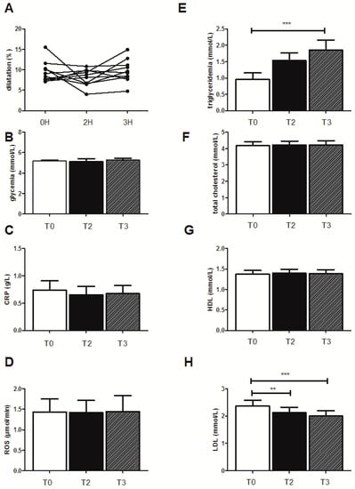 Again, the HFM did not affect any biological parameters in the selected subgroup of the 10 patients except for triglyceridemia, which increased significantly after the HFM from 0.96 ± 0.19 mmol/L to 1.53 ± 0.23 mmol/L and to 1.85 ± 0.3 mmol/L (p < 0.001), at 2 and 3 h after the HFM, respectively. LDL levels were significantly decreased (2.36 ± 0.22 mmol/L before HFM ingestion, and 2.12 ± 0.19 mmol/L (p < 0.01) and 2.0 ± 0.2 mmol/L (p < 0.001) after 2 and 3 h, respectively (Figure 4H).