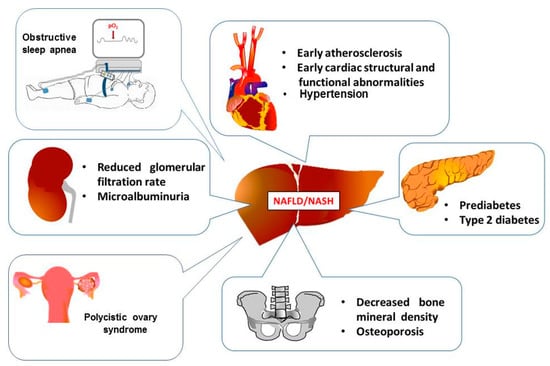 Concurrent with the increasing prevalence of obesity, nonalcoholic fatty liver disease (NAFLD) has become a major cause of chronic liver disease in childhood [1]. NAFLD is defined as the presence of fat in the liver either on imaging or on liver histology after the exclusion of secondary causes of fat accumulation such as significant alcohol consumption, use of steatogenic medications, infections, or genetic/metabolic disorders.NAFLD encompasses a broad spectrum of liver disorders ranging fromsimple steatosis to nonalcoholic steatohepatitis (NASH). NAFLD can progress to advanced liver disease, cirrhosis and hepatocellular carcinoma and indication for liver transplantation [2]. Even though NAFLD is associated with increased liver-related mortality and morbidity, cardiovascular mortality is the main cause of death in NAFLD patients [3]. This has led to a growing awareness that NAFLD, as part of a spectrum of multiple-organ conditions termed metabolic syndrome (MetS), may be associated with extrahepatic complications, in particular type 2 diabetes, hypertension and cardiovascular disease (CVD), and chronic kidney disease (CKD) [4,5,6]. Emerging data also suggest NAFLD may be a risk factor for decreased bone mineral density (BMD) and osteoporosis, and colonic adenoma/cancer in adult patients [7,8,9]. Also, in youths, there is increasing evidence that NAFLD may be associated with extrahepatic disorders such as CVD, type 2 diabetes, decreased BMD, renal dysfunction, obstructive sleep apnea (OSA), and polycystic ovary syndrome (PCOS) (Figure 1) [10,11,12,13,14,15,16,17,18,19,20,21,22]. Thus, we here report the results of a systematic review of studies that have focused on the association of these extrahepatic complications with pediatric NAFLD. In view of the clinical impact and cost-effectiveness of the disease, elucidation of the extent of the potential adverse effects of NAFLD in children and adolescents could have implications for the prevention of this frequent disease through more rigorous surveillance and early treatment interventions.