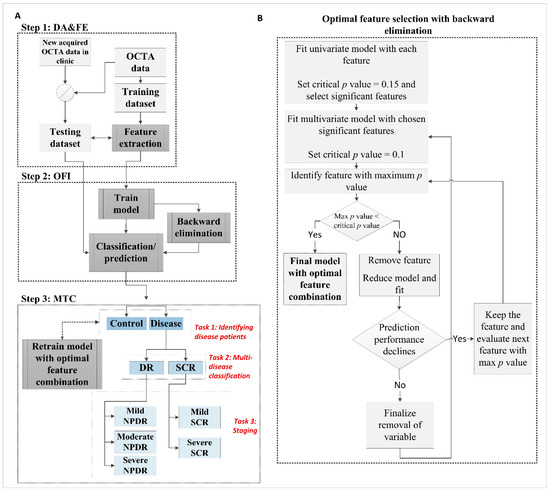 (A) Step by step methodology of artificial intelligence (AI) based classification. (B) Optimal feature selection with hierarchical backward elimination technique. DA and FE: data acquisition and feature extraction; OFI: optimal feature identification; MTC: Multiple-task classification.