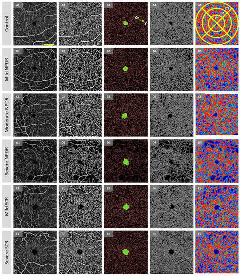The following are available online at https://www.mdpi.com/2077-0383/8/6/872/s1, Table S1: Univariate analysis of individual OCTA features for control, DR and SCR cohorts, Table S2: Univariate analysis of individual OCTA features for NPDR stages, Table S3: Univariate analysis of individual OCTA features for SCR stages.