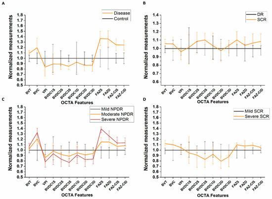 Normalized feature trends for different cohorts. (A) Change in disease group (DR and SCR) compared to control. (B) Change in SCR compared to DR. (C) Change in moderate and severe NPDR compared to mild NPDR. (D) Change in severe SCR compared to mild SCR. Error bars represent standard deviation.