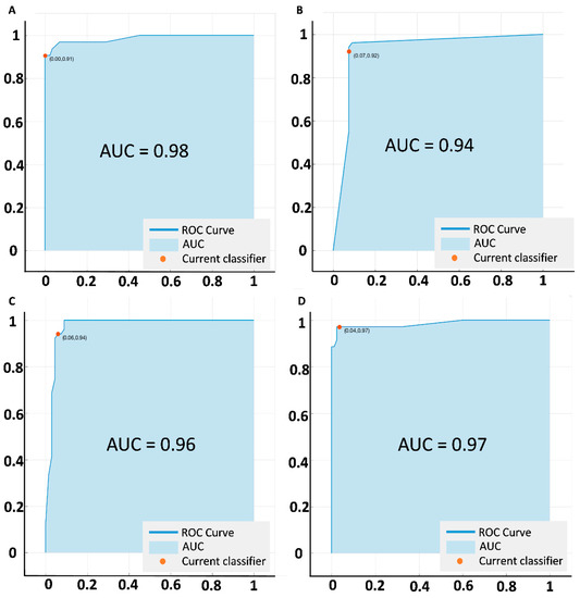 The performance of the prediction model was evaluated with sensitivity, specificity, and accuracy metrics. Receiver Operation Characteristics (ROC) curves were also generated along with area under the ROC curve (AUC). The ROC curve plots the true positive rate (i.e., sensitivity) as a function of false positive rate (i.e., 1-specificity) at different tradeoff points. Then AUC was measured to quantify how well the classifier was able to identify the different classes. The closer the curve to the upper left corner, the more accuracy the prediction was. A value of AUC equal to 1 or 100% represented a perfect prediction, and 0.5 or 50% represented a bad prediction.
