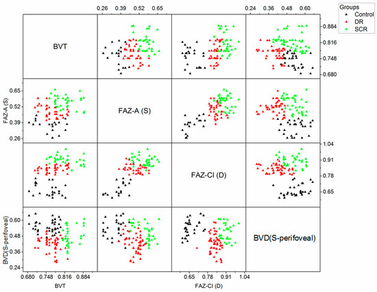 Our study demonstrated that an optimal combination of OCTA features can achieve maximum diagnostic accuracy for all classification tasks. As supported by results from Table 2 and Figure 3, we can observe that, in all performance metrics, the classification model trained with optimal feature combination demonstrated better diagnostic proficiency compared to the model trained with individual features or combination of all features. The OCTA features analyzed in this study represent vascular and foveal distortions in retina due to retinopathy from both superficial and deep layers as well as localized circular regions in the retina (BVD). Out of all these OCTA features, the feature selection strategy identified the most sensitive features for each classification tasks to significantly distinguish different cohorts. The high diagnostic accuracy of the SVM classifier trained with optimal feature combination highlights the importance of the most relevant feature selection in automated classification. Few features that showed significance in the univariate analysis (Supplementary Tables) were not selected in the final set of optimal features. This suggests a contrast between clinical applicability and overall difference of OCTA features among different patient groups. Ashraf et al. [19] observed a similar phenomenon when using feature selection for automated staging of DR eyes. In all the classification tasks, the most sensitive features also had low correlation amongst themselves. Figure 5 illustrates a scatter plot showing correlation analysis for DR vs. SCR classification. We can observe that only FAZ parameters had positive correlation with each other; BVT and BVD both were not significantly correlated with FAZ parameters (Spearman’s rank test, p > 0.05), suggesting that all the features provided different pathological aspects of the diseased retina. Therefore, the four optimal features were objective for identifying DR or SCR associated distortions and their combination yielded strong classification performance.