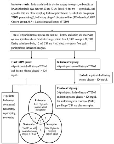 A total of 80 participants completed the preliminary evaluation and underwent optional spinal anesthesia for elective surgery from June 1, 2016, to August 31, 2018, at Linkou Chang Gung Memorial Hospital, which is a tertiary teaching hospital in northern Taiwan. Of the 80 study subjects, 40 had a history of T2DM and were taking oral hypoglycemic agents (OHA) whereas the other 40 (control subjects) denied a history of T2DM. The study participants were aged between 20 and 70 years, conformed with The American Society of Anesthesiologists (ASA) physical status classification ≤ 3 in T2DM patients or ASA ≤ 2 in control subjects. All study subjects were admitted one day before elective surgeries, including urologic surgery (transurethral lithotomy, transurethral resection of the prostate), orthopedic surgery for lower extremity (hallux valgus correction, debridement), and lower abdominal surgery (herniorrhaphy) and fasted for at least 8 h before blood and CSF sampling. We excluded four control subjects from subsequent analyses because of their fasting blood glucose > 126 mg/dL, which was classified into diabetes according to American Diabetes Association diagnosis criteria [1]. On the other hand, all the fasting blood glucose levels in T2DM patients were above 126 mg/dL, further confirming the group classification. The final cohort in our study included 40 T2DM patients and 36 controls, and their demographic characteristics including age, sex, height, weight, medication history, in-hospital records, and out-of-hospital visits were recorded. The T2DM patients were further divided into subgroups of different microangiopathies according to recent medical records based on the following definitions: (1) Diabetic retinopathy defined by the presence of non-proliferative diabetic retinopathy or proliferative diabetic retinopathy in retinal photography, and the diagnosis verified by ophthalmologists. (2) Diabetic nephropathy defined by the presence of macroalbuminuria (urinary albumin/creatinine ratio > 300 mg/g) in two spot urine measurements within six months of sampling date, or existence of stage 3–5 chronic kidney disease (estimated glomerular filtration rate (eGFR) < 60 mL/min/1.73 m2). (3) Diabetic neuropathy defined by a significant peripheral sensory defect (pinprick, temperature, or vibration sensation) with medication requirement, and the diagnosis confirmed by endocrinologists or neurologists [24,25,26].