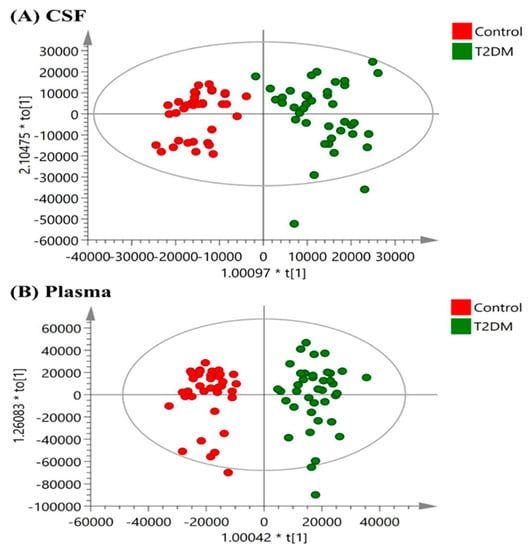 Orthogonal partial least-squares discriminant analysis (OPLSDA) score plots in (A) CSF (reliability: R2X = 0.757, R2Y = 0.852, Q2 = 0.677) and (B) plasma (reliability: R2X = 0.905, R2Y = 0.904, Q2 = 0.733) samples obtained from T2DM patients versus controls. The OPLSDA plots show a clear separation between T2DM and the control group in CSF and plasma samples.