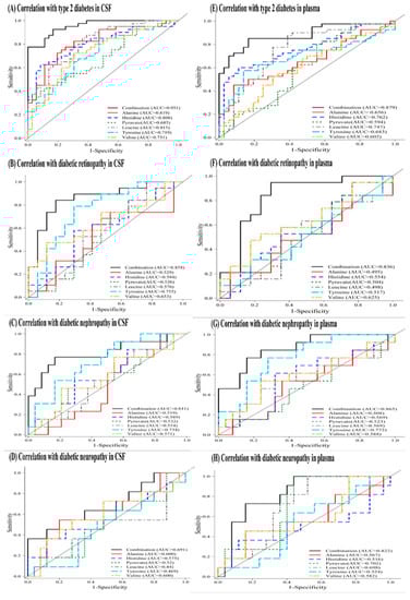 Receiver operating characteristic (ROC) curve of six-metabolite combination for correlation with the presence of type 2 diabetes and diabetic microangiopathy (retinopathy, nephropathy, and neuropathy) in CSF (A–D) and plasma (E–H) samples. The six-metabolite combination consists of alanine, histidine, leucine, pyruvate, tyrosine, and valine. Each subfigure consists of seven correlation curves including six single metabolite and their combination.